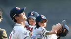 [OSEN=잠실, 이대선 기자] 9일 오후 서울 잠실야구장에서 '2015 타이어뱅크 KBO리그' 두산 베어스와 한화 이글스의 경기가 열렸다. 경기에 앞서 시구를 마친 가수 슈와 남편 임호성이 자녀들과 함께 그라운드로 나가고 있다. 두산은