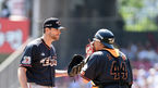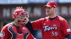 [OSEN=잠실, 지형준 기자] 10일 오후 서울 잠실구장에서 열린 '2015 타이어뱅크 KBO리그' 두산 베어스와 한화 이글스의 경기, 2회말 1사 2,3루에서 한화 탈보트가 두산 김재환 타석에 폭투로 실점을 허용하며 조인성과 이야기를 나누