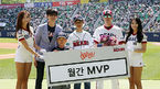 [OSEN=조인식 기자] 두산 베어스가 10일 잠실 한화전에 앞서 팀 자체적으로 선정하는 '두타' 4월 MVP 시상식을 실시했다. 4월 MVP로는 투수 부문 유희관, 타자 부문 김재호가 각각 선정됐다. 유희관은 4월 한달 간 5경기에 선발 등판