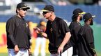 [OSEN=피츠버그(미국 펜실베니아주), 최규한 기자] 10일(한국시간) 미국 펜실베니아주 PNC파크에서 열리는 '2015 메이저리그' 피츠버그 파이어리츠와 세인트루이스 카디널스와의 경기를 앞두고, 피츠버그 강정호가 동료들과 몸을
