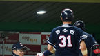 [OSEN=인천, 민경훈 기자] 13일 오후 인천 SK행복드림구장에서 열린 '2015 타이어뱅크 KBO 리그' SK 와이번스와 두산 베어스의 경기, 7회초 2사 주자 2루 두산 오재원이 우월 투런 홈런을 날린 후 덕아웃에서 오재원과 정수빈이 김태형