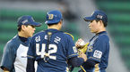 [OSEN=잠실, 민경훈 기자] 14일 오후 서울 잠실야구장에서 열린 '2015 타이어뱅크 KBO 리그' LG 트윈스와 NC 다이노스의 경기, 3회말 2사 주자 1,2루 LG 이병규 타석에서 마운드에 오른 NC 최일언 코치가 이재학과 얘기를 나누고 있다. 이