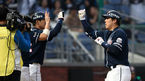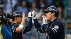 [OSEN=인천, 이대선 기자] 14일 오후 인천SK행복드림구장에서 '2015 타이어뱅크 KBO 리그' SK와 두산의 경기가 열렸다. 2회초 1사 1,3루에서 두산 김현수가 좌월 스리런 홈런을 치고 홈에서 김재호와 하이파이브를 하고 있다. SK는 두산