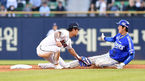 [OSEN=잠실, 김경섭 기자] 21일 오후 서울 잠실야구장에서 열린 '2015 타이어뱅크 KBO 프로야구' 두산 베어스와 삼성 라이온즈의 경기, 2회말 2사 주자 1루 두산 오재원이 도루를 시도하다 아웃당하고 있다. 두산은 물이 오를 대로 오