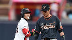[OSEN=수원,박준형 기자] 22일 오후 경기도 수원시 수원구장서 열린 ‘2015 타이어뱅크 KBO리그’ kt 위즈와 한화 이글스의 경기, 1회말 무사 1,2루 kt 하준호가 1타점 적시 2루타를 날리고 손가락 보호대를 입에 문채 타임을 요청하고