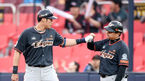[OSEN=수원,박준형 기자] 22일 오후 경기도 수원시 수원구장서 열린 ‘2015 타이어뱅크 KBO리그’ kt 위즈와 한화 이글스의 경기, 1회초 1사 1,2루 한화 최진행이 선취 1타점 적시타를 날리고 임수민 1루 코치와 하이파이브를 하고 있
