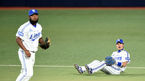 [OSEN=대구, 이대선 기자] 26일 오후 대구 시민운동장야구장에서 '2015 타이어뱅크 KBO 리그' 삼성과 넥센 히어로즈의 경기가 열렸다. 5회초 무사 1루에서 삼성 김상수가 나바로의 실책 장면을 바라보고 있다. 삼성은 알프레도 피가