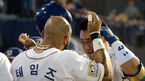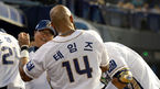 [OSEN=마산, 이대선 기자] 28일 오후 경남 창원 마산야구장에서 '2015 타이어뱅크 KBO 리그' NC 다이노스와 두산 베어스의 경기가 열렸다. 4회말 1사에서 NC 김태군이 좌월 솔로 홈런을 치고 더그아웃에서 테임즈와 세리머니를 펼치고