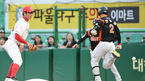 [OSEN=인천, 곽영래 기자] 28일 오후 인천SK행복드림구장에서 '2015 타이어뱅크 KBO 리그' SK 와이번스와 롯데 자이언츠의 경기가 열렸다. 1회말 무사 1루 롯데 김승회가 SK 조동화의 타구를 잡으려다 중심을 잃고 있다. 롯데는 김승회
