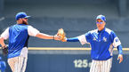 [OSEN=잠실, 민경훈 기자] 31일 오후 서울 잠실야구장에서 '2015 타이어뱅크 KBO 리그' LG 트윈스와 삼성 라이온스의 경기가 열릴 예정인 가운데, 삼성 이승엽이 수비 훈련 때 나바로에게 공을 던져주고 있다. 이 날 경기에서 LG와 삼