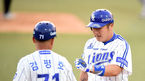 [OSEN=대구, 지형준 기자] 9일 오후 대구야구장에서 '2015 타이어뱅크 KBO 리그' 삼성 라이온즈와 한화 이글스의 경기가 열렸다. 1회말 1사 2,3루에서 삼성 최형우가 선취 2타점 적시타를 날리고 김평호 코치와 주먹을 맞대고 있다.