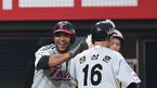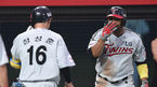 [OSEN=수원, 김경섭 기자] 24일 오후 경기 수원 kt위즈파크에서 '2015 타이어뱅크 KBO 리그' kt 위즈와 LG 트윈스의 경기, 4회초 2사 2루 LG 정성훈이 2점홈런을 치고 히메네스와 기쁨을 나누고 있다. LG 트윈스 우완투수 임정우가 올 시