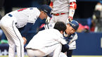 [OSEN=잠실, 지형준 기자] 24일 오후 서울 잠실야구장에서 '2015 타이어뱅크 KBO 리그' 두산 베어스와 SK 와이번스의 경기가 열렸다. 4회초 무사에서 두산 양의지가 SK 정상호 타석에 타구에 맞아 부상을 입고 교체되고 있다. 두산은