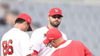 [OSEN=광주, 민경훈 기자] 1일 오후 광주 기아 챔피언스 필드에서 열린 '2015 타이어뱅크 KBO 리그' KIA 타이거즈와 한화 이글스의 경기, 3회말 2사 만루 KIA 김다원 타석에서 한화 선발 유먼과 니시모토 타카시 투수코치가 얘기를 나누