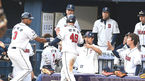 [OSEN=광주, 민경훈 기자] 2일 오후 광주 기아 챔피언스 필드에서 열린 '2015 타이어뱅크 KBO 리그' KIA 타이거즈와 한화 이글스의 경기, 1회초 2사 주자 만루 한화 권용관의 몸에 맞는 볼로 밀어내기 득점을 올린 김태균이 덕아웃에