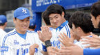 [OSEN=대구, 민경훈 기자] 3일 오후 대구 대구시민운동장 야구장에서 열린 '2015 타이어뱅크 KBO 리그' 삼성 라이온즈와 LG 트윈스의 경기가 열릴 예정인 가운데, 경기 전 삼성 이승엽 400홈런 시상식을 마친 후 동료들과 하이파이브