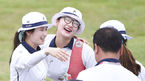 [OSEN=광주, 박준형 기자] 8일 오전 광주시 광주국제양구장서 열린 '2015 광주하계유니버시아드대회' 여자 양궁 리커브 단체전 한국과 대만의 경기, 2세트 동점 스코어를 만든 대표팀이 미소 짓고 있다. 남자 대표팀은 김우진(청주