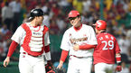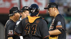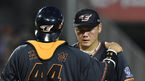 [OSEN=도쿄(일본), 김경섭 기자] 10일 오후 일본 도쿄돔에서 일본프로야구 요미우리 자이언츠와 한신 타이거즈의 경기가 펼쳐졌다. 6회초 1사 요미우리 선발투수 포레다와 포수 가토가 한신 고메즈의 타석에 이야기를 나누고 있다