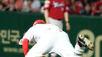 [OSEN=인천, 이대선 기자] 10일 오후 인천SK행복드림구장에서 '2015 타이어뱅크 KBO 리그' SK 와이번스와 KIA 타이거즈의 경기가 열렸다. 5회초 1사 1루에서 KIA 나지완과 1루주자 필을 더블 아웃 처리하며 가슴 통증을 호소하고 있다. KI