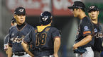 [OSEN=잠실, 백승철 기자] 10일 오후 서울 잠실구장에서 열린 '2015 타이어뱅크 KBO 리그' LG 트윈스와 한화 이글스의 경기 9회말 1사 1,2루 김성근 감독이 마운드에 올라와 윤규진의 볼을 만지고 있다. LG는 이날 한화 이글스와 시즌 10