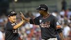 [OSEN=잠실, 최규한 기자] 11일 오후 서울 잠실야구장에서 '2015 타이어뱅크 KBO 리그' LG 트윈스와 한화 이글스의 경기가 열렸다. 5회말 LG 공격을 무실점으로 막아낸 한화 선발 유먼이 더그아웃으로 향하며 2루수 정근우와 인사를
