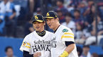 [OSEN=지바(일본), 김경섭 기자] 12일 오후 일본 지바현 QVC 마린필드에서 열린 2015 일본프로야구 지바롯데 마린스와 소프트뱅크 호크스의 경기, 1회초 이닝종료후 소프트뱅크 후쿠다가 1루주자였던 이대호에게 장비를 가져다주고