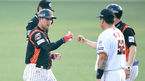 [OSEN=청주, 이대선 기자] 14일 오후 청주야구장에서 '2015 타이어뱅크 KBO 리그' 한화 이글스와 롯데 자이언츠의 경기가 열렸다. 1회초 2사에서 롯데 황재균이 중전 안타를 치고 하이파이브를 하고 있다. 한화는 탈보트를 선발 투수