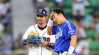 [OSEN=지형준 기자] 1일 오후 서울 잠실야구장에서 '2015 타이어뱅크 KBO 리그' 두산 베어스와 삼성 라이온스의 경기가 열렸다. 4회초 2사 1루에서 삼성 이승엽이 이지영 타석에 두산 스와잭의 폭투로 2루로 향하며 오재원과 이야기