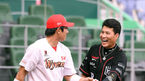 [OSEN=인천, 김경섭 기자] 8일 오후 인천 SK행복드림구장에서 '2015 타이어뱅크 KBO 리그' SK 와이번스와 kt 위즈의 경기가 펼쳐졌다. 경기시작전 SK 박정권과 kt 김상현이 이야기를 나누고 있다. SK와 kt는 각각 좌완 투수 김광현과 정대