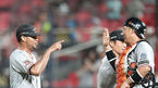 [OSEN=부산, 곽영래 기자] 11일 부산 사직구장에서 '2015 타이어뱅크 KBO 리그' 롯데 자이언츠와 SK 와이번스의 경기가 열렸다. 8회초 2사 1,3루 롯데 강영식이 마운드에 올라 강민호와 이야기를 나누고 있다. 롯데는 우완 송승준을 선