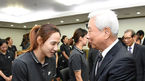 [OSEN=지형준 기자] 여자농구대표팀이 26일 오전 서울 올림픽 파크텔에서 제 26뢰 FIBA 아시아여자농구선수권대회 결단식을 가졌다. 방열 대한농구협회장이 이경은을 격려하고 있다. 대표팀은 이미선(36, 삼성), 신정자(35, 신한은
