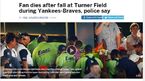 미국 야구장에서 야구팬이 추락한 안타까운 사고가 발생했다. 미국 ‘ESPN’을 포함한 복수의 현지 매체는 30일(이하 한국시간) 애틀랜타 브레이브스의 홈구장인 터너 필드에서 한 남성팬이 관중석 상단에서 떨어져 추락사했다