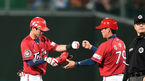[OSEN=잠실, 곽영래 기자] 2일 오후 서울 잠실구장에서 '2015 타이어뱅크 KBO 리그' 두산 베어스와 SK 와이번스의 경기가 열렸다. 5회말 1사 1루 SK 브라운이 이대수의 송구를 잡아 병살로 이닝을 마친 뒤 켈리와 하이파이브를 하고 있
