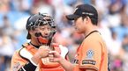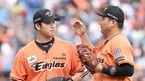 [OSEN=대전, 최규한 기자] 6일 오후 대전 한화생명이글스파크에서 '2015 타이어뱅크 KBO리그' 한화 이글스와 두산 베어스의 경기가 열렸다. 6회까지 무실점 호투 중인 한화 선발 김민우가 포수 조인성과 대화를 나누고 있다. 두산은