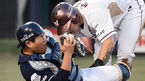 [OSEN=목동, 백승철 기자] 8일 오후 서울 목동구장에서 열린 '2015 타이어뱅크 KBO 리그' 넥센 히어로즈와 두산 베어스의 경기 1회말 2사 1,3루 더블스틸 시도에 3루주자 박병호가 홈에서 양의지와 충돌하고 있다. 박병호는 아웃. 넥