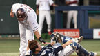 [OSEN=목동, 백승철 기자] 8일 오후 서울 목동구장에서 열린 '2015 타이어뱅크 KBO 리그' 넥센 히어로즈와 두산 베어스의 경기 1회말 2사 1,3루 더블스틸 시도에 3루주자 박병호가 홈에서 양의지와 충돌 후 양의지의 상태를 살피고 있