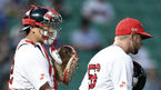 [OSEN=인천,박준형 기자] 8일 인천SK행복드림구장에서 열린 ‘2015 타이어뱅크 KBO리그’ SK 와이번스와 롯데 자이언츠의 경기, 1회초 SK 선발투수 켈리와 정상호 포수가 이야기를 나누고 있다. 켈리는 올 시즌 24경기에서 7승9패 평