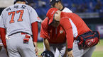 [OSEN=대전,박준형 기자] 10일 오후 대전 한화생명이글스파크에서 열린 2015 타이어뱅크 KBO리그 한화 이글스 SK 와이번스의 경기,2회초 SK 김성현의 헛스윙 삼진때 1루 귀루하는 과정서 부상당한 박진만이 교체되고 있다. 한화는 외