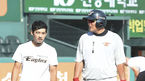 [OSEN=대전,박준형 기자] 10일 오후 대전 한화생명이글스파크에서 열리는 2015 타이어뱅크 KBO리그 한화 이글스 SK 와이번스의 경기에 앞서 한화 김성근 감독이 김태균과 이야기를 나누고 있다. 한화는 외국인 투수 미치 탈보트가