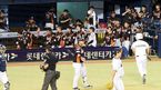 [OSEN=잠실, 최규한 기자] 15일 오후 서울 잠실야구장에서 '2015 타이어뱅크 KBO 리그' 두산 베어스와 롯데 자이언츠의 경기가 열렸다. 6회초 롯데 공격 무사 3루 상황 안중열의 1타점 희생플라이 때 홈을 밟은 오승택이 더그아웃 동