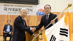 [OSEN=진천, 이대선 기자] 17일 오후 충북 진천군 진천선수촌에서 김동광 감독이 지휘하는 남자농구대표팀 결단식이 열렸다. 방열 대한농구협회장이 박한 선수단장에게 단기를 전달하고 있다. 김동광 감독이 지휘하는 남자농구