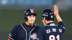 [OSEN=부산,박준형 기자] 24일 오후 부산 사직구장서 열린 '2015 타이어뱅크 KBO리그' 롯데 자이언츠와 두산 베어스의 더블헤더 2경기, 4회초 2사 1,2루 두산 최주환이 선취 1타점 적시타를 날리고 강동우 코치와 하이파이브를 하고