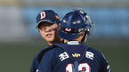 [OSEN=부산,박준형 기자] 24일 오후 부산 사직구장서 열린 '2015 타이어뱅크 KBO리그' 롯데 자이언츠와 두산 베어스의 경기, 8회말 두산 함덕주 투수가 교체전 최재훈 포수와 포옹을 하고 있다. 이날 경기는 KBO 리그에서 1106일만에 열