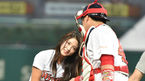 [OSEN=인천 이동해 기자] 25일 오후 인천 SK행복드림구장에서 열린 '2015 타이어뱅크 KBO 리그' SK 와이번스와 삼성 라이온즈의 경기,설현이 시구를 마치고 정상호 선수로부터 시구공을 건네받고 있다. 삼성이 KBO 리그 역대 첫 선발