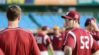 [OSEN=대전, 민경훈 기자] 25일 오후 대전광역시 한화생명이글스파크에서 '2015 타이어뱅크 KBO 리그' 한화 이글스와 넥센 히어로즈의 경기가 열릴 예정인 가운데 양 팀 훈련시간에 넥센 박병호가 이 날 선발로 나서는 밴 헤켄과 얘
