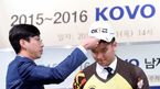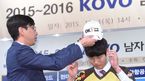 [OSEN=최규한 기자] 1일 오후 서울 청담동 호텔리베라에서 '2015~2016 KOVO 남자 신인선수 드래프트'가 진행됐다. 삼성화재 김세진 감독이 전체 7순위로 천종범을 지명한 뒤 모자를 씌워주고 있다. 이번 남자 배구 드래프트 참가자는