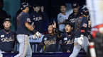 [OSEN=잠실, 백승철 기자] 2일 오후 서울 잠실구장에서 열린 '2015 타이어뱅크 KBO 리그' LG 트윈스와 한화 이글스의 경기 6회초 2사 2,3루 최진행의 2타점 적시타에 득점한 이용규, 신성현이 덕아웃에서 동료들과 하이파이브를 하고