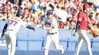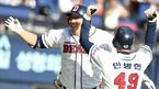[OSEN=잠실, 최규한 기자] 4일 오후 잠실구장에서 '2015 타이어뱅크 KBO 리그' 두산 베어스와 KIA 타이거즈의 경기가 열렸다. 6회말 두산 공격 1사 1, 2루 상황 김현수가 우월 스리런포를 날리고 홈을 밟은 뒤 정수빈과 인사를 나누고