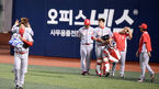 [OSEN=목동, 민경훈 기자] 7일 오후 서울 목동구장에서 열린 '2015 타이어뱅크 KBO 리그' 넥센 히어로즈와 SK 와이번스의 와일드카드 결정 1차전, 1회초 SK 선두타자 이명기가 스트라이크 낫 아웃 폭투로 1루를 밟은 후 백재호 코치와