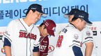 [OSEN=잠실, 지형준 기자] '2015 타이어뱅크 KBO 리그' 두산 베어스와 넥센 히어로즈의 포스트시즌 준플레이오프 미디어데이가 9일 오후 잠실구장에서 열렸다. 두산 유희관이 김현수 답변을 들으며 즐거워하고 있다. 두산과 넥센은
